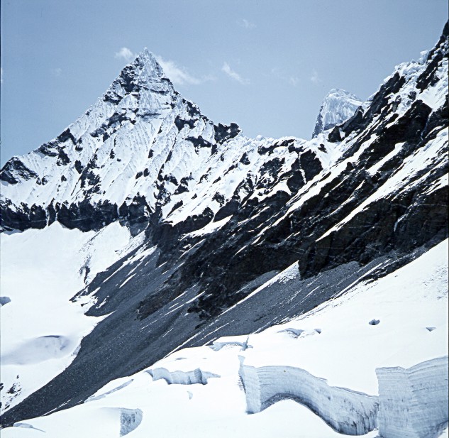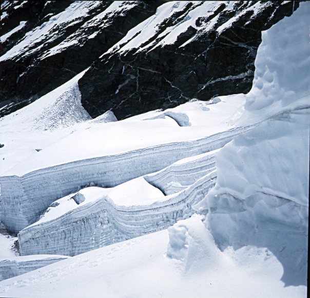 For the moment we are safe but enough dangers and strenuous efforts are lying ahead of us. In the mean time, however, the weather has worsened and a dense monsoon fog whirling with snow has developed in such a manner that we cannot see further than five metres. The descent across the crevasses-rich glacier is just one gloomy horror trip. The crevasses are there but we cannot see them anymore. The fear of these invisible crevasses does not cease before we are reaching the icefall. Here too we dont see anything and we are staggering down exhausted to our limits.