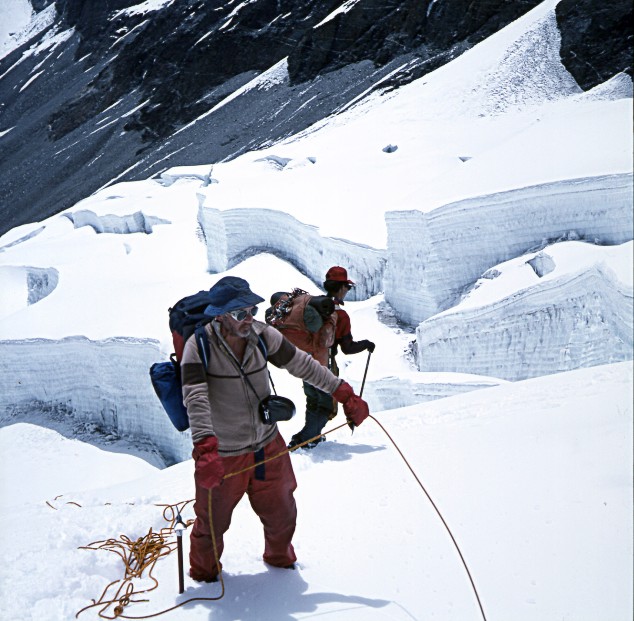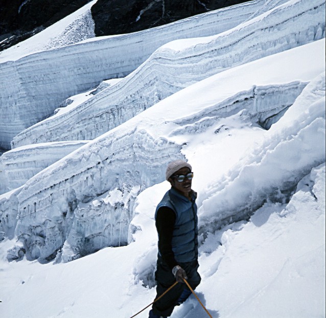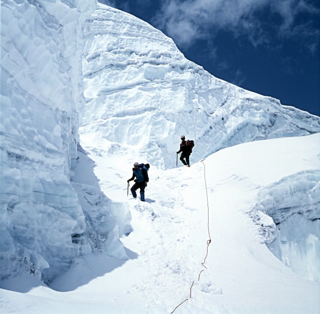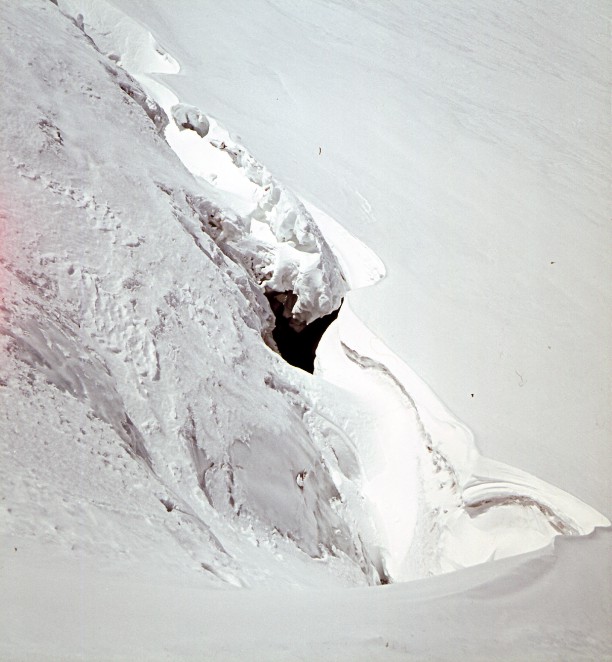 A spine-chilling, terrible time unit later I am groping my way to the crevasse and I am looking enveloped in icy fear into the frightening, blueish-green bottomless depth of the crevasse. There I see to my boundless relief as if the hugest mountain on earth has been removed from my heart, Ang Tschumbi. He is alive and he cowers in approximately ten metres depth and utters a not defined sound of terror. In spite of our desperate situation, Ang Tschumbi has got the luck of this life. He has fallen onto a fragile looking ice bridge which spans like air regular arch of glass between the slippery ice walls of the crevasse. Because the crevasse is tapering to the top he is in spite of the crampons at his feet not able to climb out on his own and consequently to free himself from his icy prison. Ang Tschumbi has got the rope and I must try to get hold of it. I cannot remember anymore how long we are struggling until we succeed an I have one rope-end in my hands. After securing myself I can rescue poor Ang Tschumbi out of his icy hell.