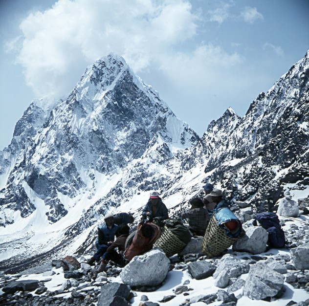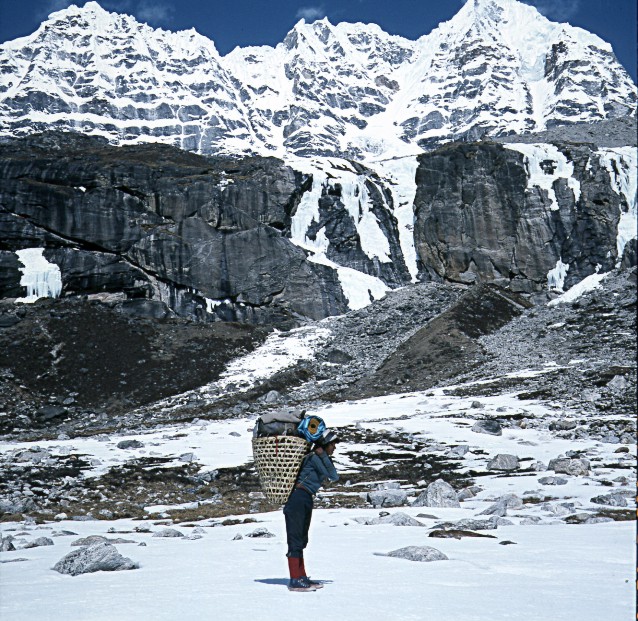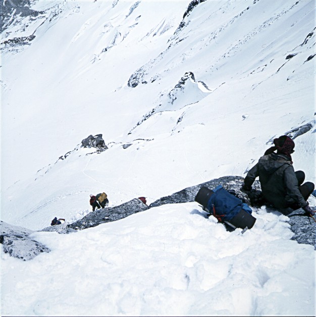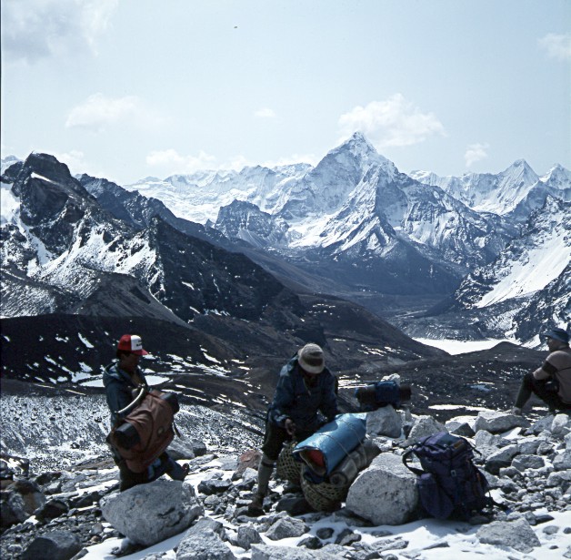 We had to give up our Access Route to West Col and Sherpani Col to Makalu Base Camp, because that would had endangered the life of th seriously ill Bruce Campbell-Watt, which I now diagnosed to have the life threatening Pulmonary Endema. The only way out was to climb to lower altitudes below 5 000 m in the Hongu Valley and then climp up again to the Mera La 5 420 m. Bruce was carried by our porters, a torture for all participants involved in this exercise.
