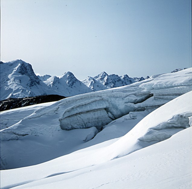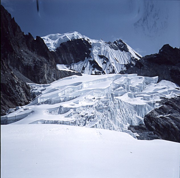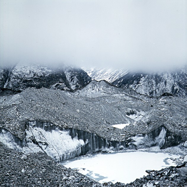 The ascent with the ill Bruce Campbell Watt to the 5420 m high Mera La during a blizzard, fog and paralysing cold is bringing us to the very verge of our strength. Struggling in soft deep snow we are reaching our stormy cold location of the Mera La base camp. Before this our Sherpa guides have repeatedly lost their direction. By losing the way in the thick fog the danger is imminent that we are slipping down into the abyss of the icefalls and glaciers surrounding our camp from all directions. We find ourselves here in the first Himalaya mountain range which is fully exposed to the tropical monsoon storms and has consequently the most fantastically formed ice- and glacier formations. |