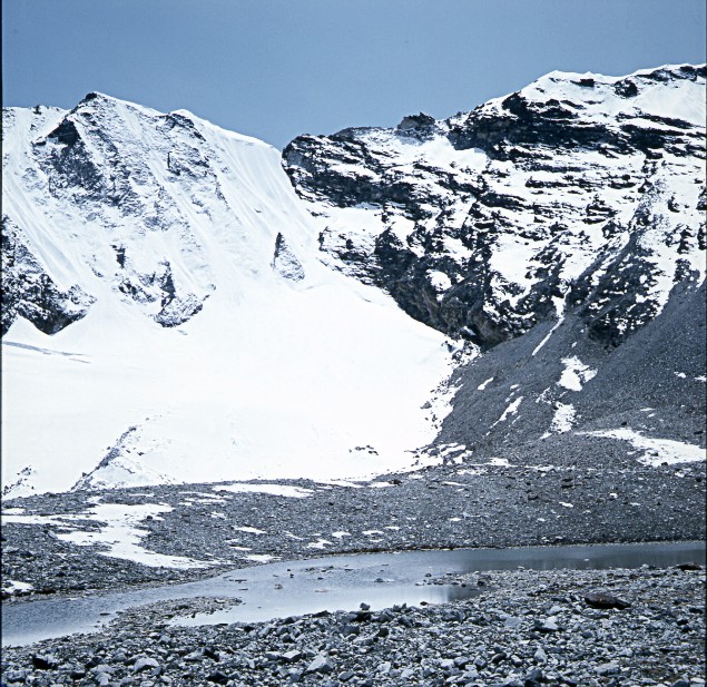 The Hongu is one of the least accessible and completely deserted wilderness areas in the Himalayas. Due to this seclusion no yak pastures are existing here like they do in all other regions of the high Himalayas below 5000 m. The only possible accesses to this wilderness are four difficult and glaciated mountain ranges which are all above 6000 m in altitude, the Mingbo La in the north-west the Amphu Laptsa in the north, the West Col in the north-east and the Mera La in the south-west. It is not possible to follow the course of the river Hongu Drangka because the Hongu river is losing itself in a chaotic system of vertical, several thousand metres deep gorges, a truly vertical landscape which even scared the Sherpas away from any settlement. |