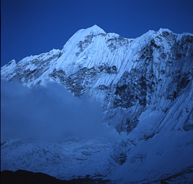 The snow- and weather conditions are miserable in this premonsoon period of 1982. Each day heavy snow is falling and we are only able to climb difficult pitches in the early mornings before the snow is beginning to fall and as long as the deep frost is still stabilising the snow covered steep surfaces and consequently reducing the danger of avalanches. For the pre- monsoon season it is still to cold and the hazard of avalanches is exceeding all fair limits with all the fresh snow masses. Our first two peaks in this year, Gokyo Kang and white Peak, are presenting some mountaineering problems although both are known to be easy to climb. The crossing of the 5690 m high Cho La Col is demanding ultimate effort from us: glaciers, a difficult ice couloir which we are inching up with our heavy homes on our backs, icefalls and a vertical rock wall which we have to descent by the mountaineering technique of abseiling. Because it represents such a effort to climb to these heights the memory with regard to the overwhelming natural beauties remains so strongly in our consciousness: The view of glaciers, several icefalls one upon another, all the ice giants surrounding us: Amai Dablam, the holy peak of the Khumbu, Nuptse with its nearly 8000 m, Cholatse (Jobo Lhaptshan) and the "third pole of the earth": Chomo Lungma, the goddess mother of the world. |