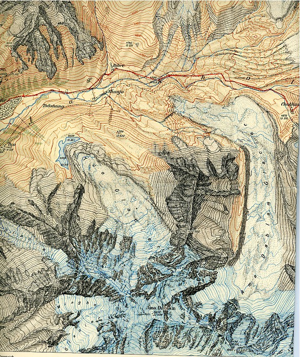 Parallel to the east of the Gokyo Valley (Ngozumpa Glacier Valley coming from the Cho Oyu and the Gyachung Kang) runs the Khumbu Galcier Valley coming fom Chomolungma - Mount Everest. The connection between the two valleys os established by the Cho La Col 5 690 m which we have to cross in order to reach the Everest Base Camp