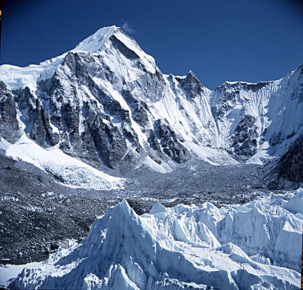Gyachung Kang 7 922 m at the Tibetan Border with the Ngozumpa Glacier in the ForegroundThe Ascent to Gokyo Peak 5 483 m: View to the Southeast to Jobo