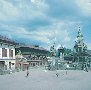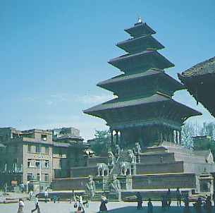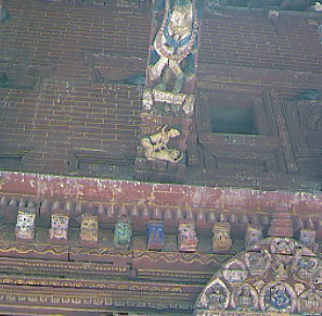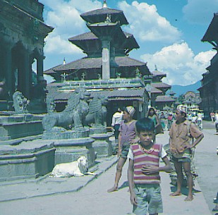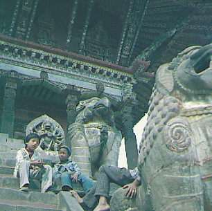 Ich laufe im Palastbezirk durch einen Wald von pittoresken Tempelpagoden, durch den auch hier, wie überall, voller leicht angeschmuddelter Heiterkeit, das dichte, menschliche Leben pulsiert. Ich bestaune die kunstvoll geschnitzten Szenen an den Tempeldachstreben und frage mich nach dem Sinn und Zweck dieser freizügigen, erotischen Darstellungen. Manche Betrachter geben ihnen eine tantrisch-philosophische Auslegung, andere wiederum unterstützen die Theorie, daß die Schnitzereien die Menschen dazu veranlassen sollen, beim Tempelbesuch alle sündigen Gedanken fahren zu lassen. Im Gegensatz zu dieser frommen Denkungsweise ist es auch nicht auszuschließen, daß die Gläubigen mit Hilfe dieses mittelalterlichen "Pornos" in die Tempel gelockt werden sollten. Wer weiß? In Nepal schlagen die Uhren anders, jeder kann sich denken, was er will.