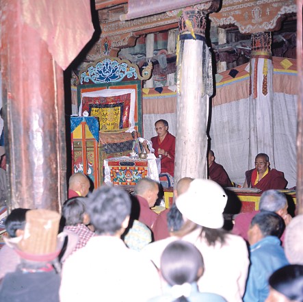 Die Luft ist schwer von Weihrauch, dem Geruch von Hunderten von Butterlämpchen, sowie von altem vergilbten Papier und moderndem Holz. Die düsteren, tiefrot angemalten Holzsäulen und die schweren Stoffbahnen, die überall an die Wände drapiert sind, lassen den Raum noch düsterer erscheinen. Genau gegenüber der Tür sitzt der uralte Chef-Lama, der Rimpoche, mit untergeschlagenen Beinen im Lotussitz auf einem etwas erhöhten Thron, vor dem ein kleiner Tisch steht. Zwei Reihen von niedrigen, mit Kissen belegten Bänken führen zum Thron des Rimpoche. Sie dienen als Sitze für die Mönche des Klosters. Diese sitzen in langen Reihen auf den Bänken und murmeln stundenlang Litaneien aus den heiligen Büchern, dem Kangschur und dem Tangschur. Die Gebetslitaneien werden immer wieder durch die total fremdartig klingenden Musikeinlagen und das Trinken von Buttertee unterbrochen, der von Zeit zu Zeit von einem jungen Trapa nachgeschenkt wird. Der gleiche Laienmönch schwenkt auch ab und zu ein Weihrauchgefäß. Direkt über dem Altar befinden sich die Statuen der Hauptgötter, wie die des Guru Rimpoche, des Buddha Sakyamuni oder auch des Buddha Maitreya. Rechts und links stehen weitere Standbilder von Heiligen, Bodhisattvas und früheren hohen Lamas und Gönnern der Gompa.