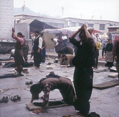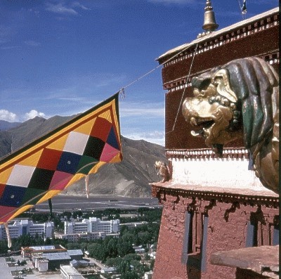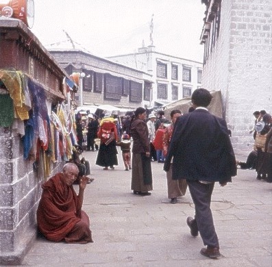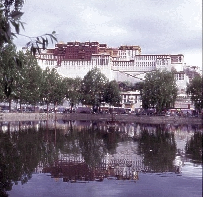 mühle dreht, weist mir den Weg zur Gompa. Schon von weitem höre ich das schnelle rhythmische Murmeln der Lamas, das nur von gedämpften, regelmäßigen Paukenschlägen begleitet wird. Vor der Gompa begrüßen mich wild bellende, gefährlich aussehende Hunde, die nach tibetischer Tradition alle Besucher - ob mit freundlichen oder feindlichen Absichten - melden sollen.Potala Palast in Lhasa im Jahre 1997