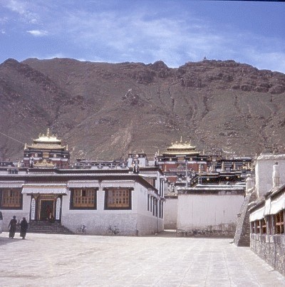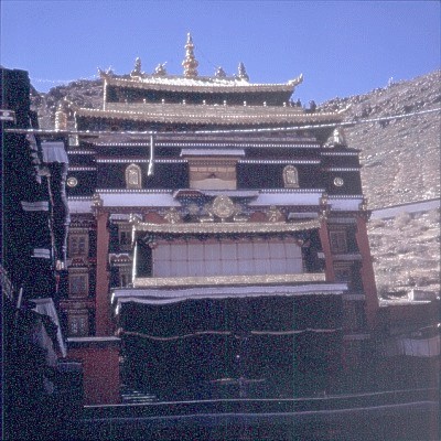 Das Haupttor in den Klosterhof ist durch einen schweren Vorhängebalken verschlossen. Auf das Rufen des Tibeters kommt ein Trapa herbeigeschlurft, um den knarrenden Balken mühsam wegzuschieben. Sobald man das Gompa-Tor durchschreitet, befindet man sich in einer anderen Welt, der Welt des tibetischen Buddhismus. Das Hauptgebäude der Gompa, das, wie fast alle Gompas, rot oder ockerfarben angestrichen ist, besteht aus zwei Stockwerken. Im Erdgeschoss befinden sich neben dem Vorraum mit einer großen, bunt bemalten und Gold beschrifteten Gebetsmühle die Haupträume der Gompa. Im Lhakang steht das Bildnis der Hauptgottheit des Tempels. Daneben ist der Dukhang, der Gebets- und Versammlungsraum der Lamas, und daran anschließend der Gonkhang, der Raum der Schutzgötter. Hier sieht man die Standbilder der Dharmapalas, der "Beschützer der Lehre" und Tschörten, in denen häufig die Gebeine von Lamas und anderen Heiligen ruhen. Im ersten Geschoss hat der inkarnierte Lama seine Gemächer, die Simtschung. Vom Dach wehen Gebetsfahnen, hier oben befinden sich auch die Dschalts, zylinderförmige Siegesbanner, die wie vergoldete Gebetsmühlen aussehen.