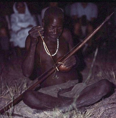Gemeinschaft im östlichen Kavango bei Andara spielt auf dem Musikbogen die