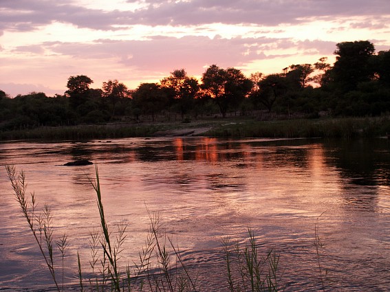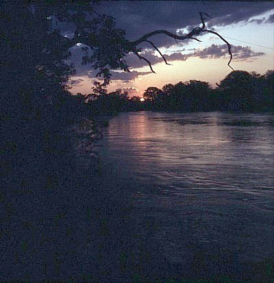 Der Okavango-Fluss bei Mukwe bei Sonnenuntergang, April 1984